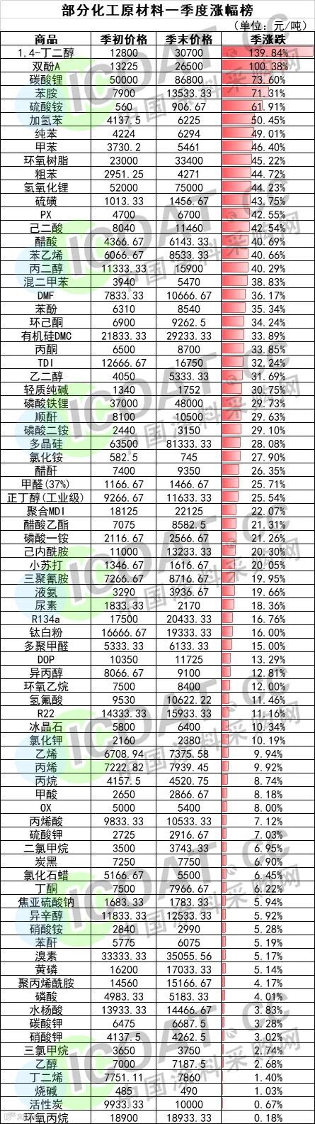 与此同时,树脂、双酚A等多种化工原材料也没有停下涨价的脚步。据有料网不完全统计,2021年一季度近百种原材料价格上调,其中丁二醇上涨139.84%,双酚A上涨100.38%,碳酸锂上涨73.60%。