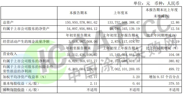 万华化学一季度实现营业收入313.12亿元,同比增长104.08%;归母净利润66.21亿元,同比增长380.82%。