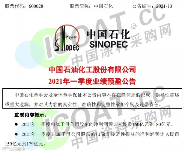 中国石化一季度归属于母公司股东的净利润预计人民币160亿元到180亿元,较2020年同期预计将实现扭亏为盈,较2019年同期预计将增加8.1%到21.6%;归属于母公司股东的扣除非经常性损益的净利润预计人民币159亿元到179亿元,较2020年同期预计将实现扭亏为盈,较2019年同期预计将增加10.4%到24.3%。