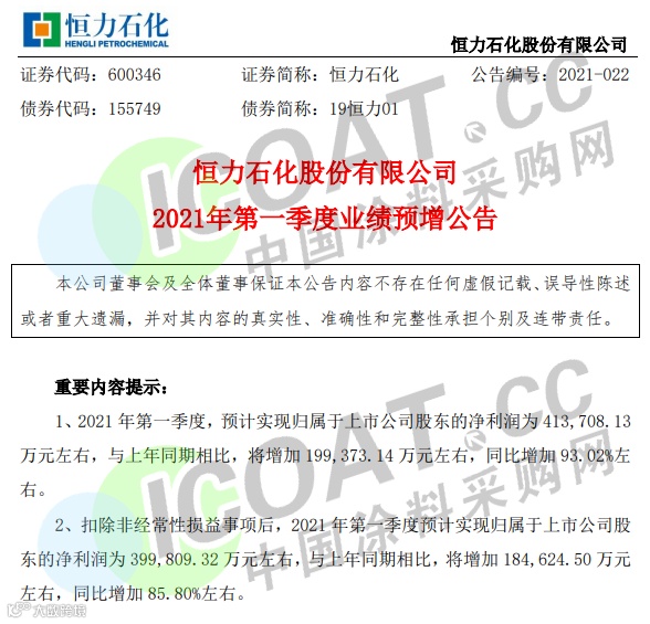 齐翔腾达预计2021年一季度归母净利5.94亿元至6.83亿元,同比增长200%-245%。