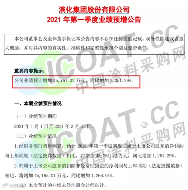 滨化股份预计一季度实现归属于上市公司股东的净利润为4.58亿元,同比增长1251.29%。