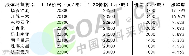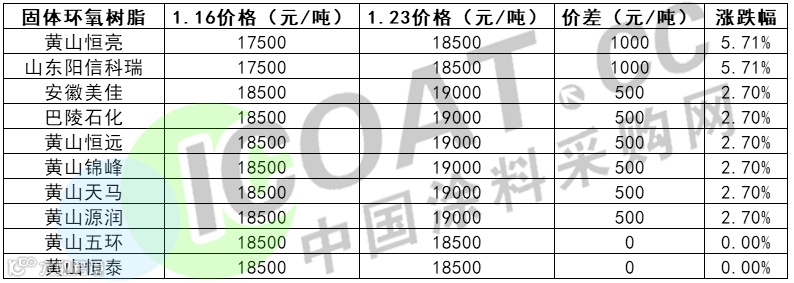 扬农锦湖报价上调3700元/吨至24500元/吨;江苏三木上调3400元/吨至23500元/吨;巴陵石化、昆山南亚、长春化工上调2000元/吨报价22800元/吨、24500元/吨、24000元/吨;南通星辰上调1400元/吨至23500元/吨;珠海宏昌、济南天茂上调1000元/吨至23000元/吨。