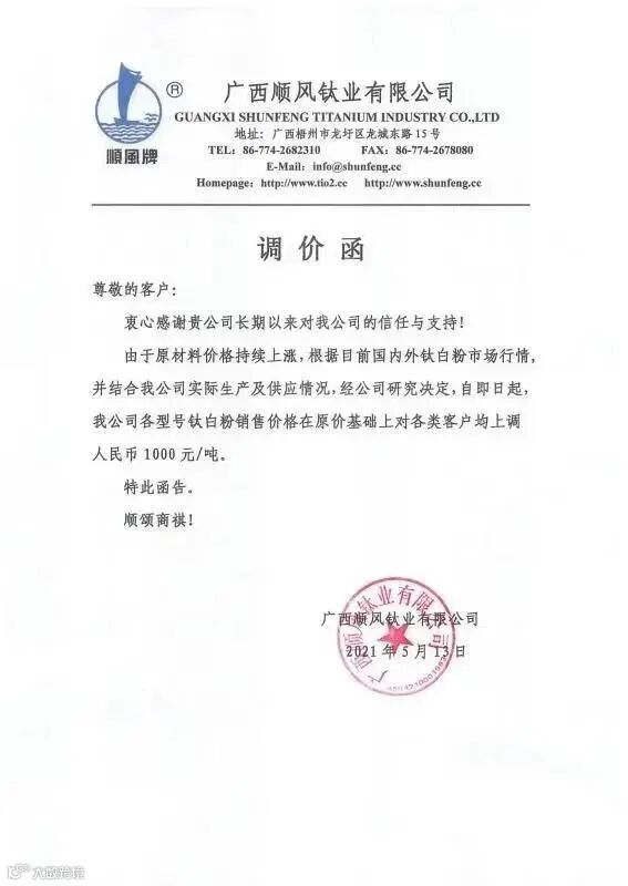 同日,广西顺风钛业发函,称即日起各型号钛白粉销售价格在原价基础上对各类客户均上调1000元/吨。