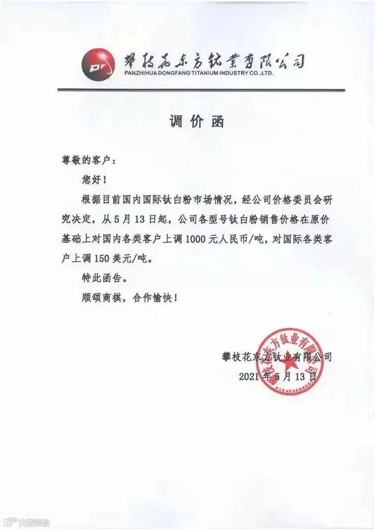 近日,攀枝花市东方钛业有限公司发函,称13日起,各型号钛白粉销售价格在原基础上对国内各类客户上调1000元/吨,对国际各类客户上调150美元/吨。