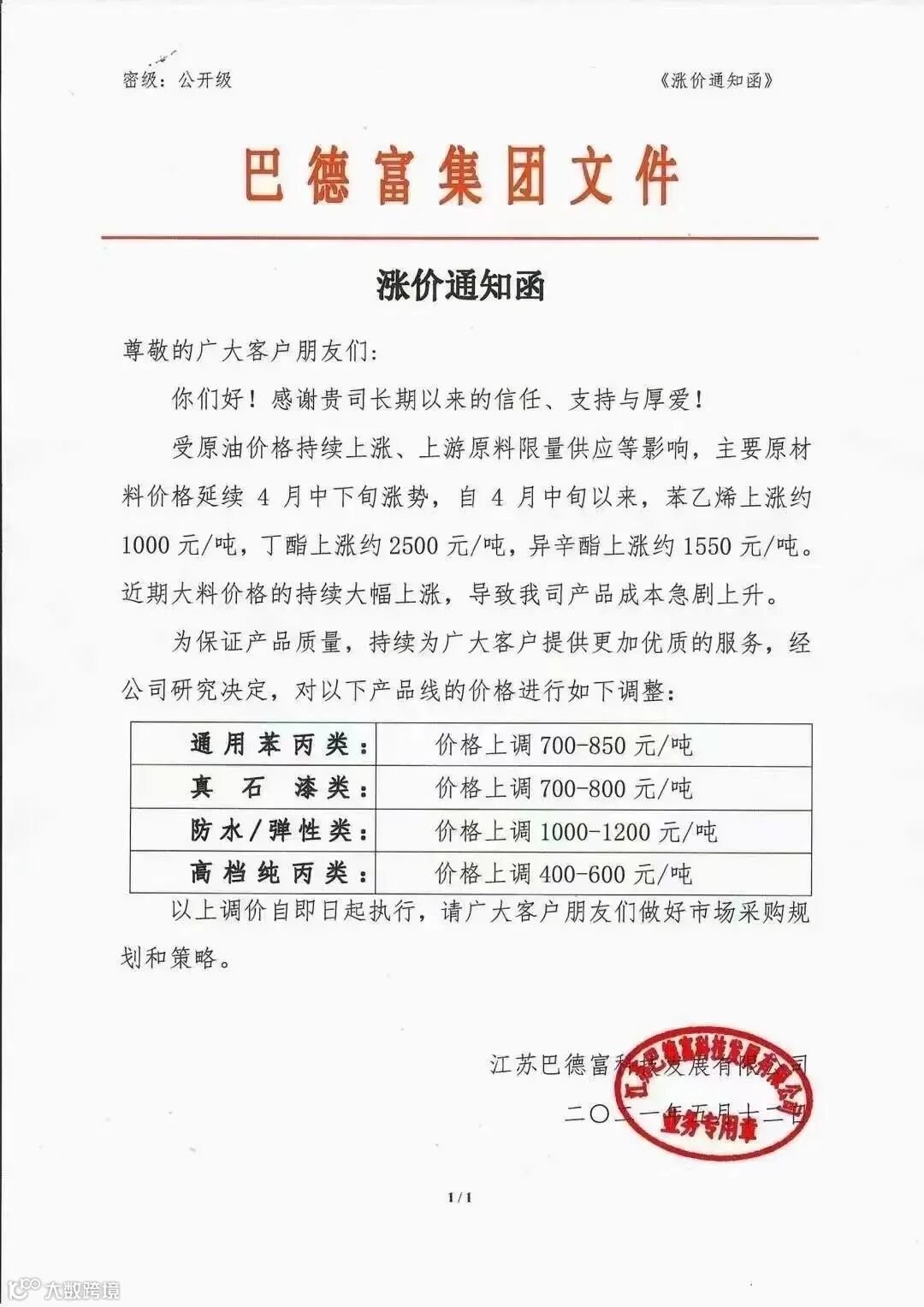 许昌威丰塑粉科技有限公司发函,称即日起全线上调销售价格,新老客户不再一一通知,以销售清单开票价格,货到签收为准。