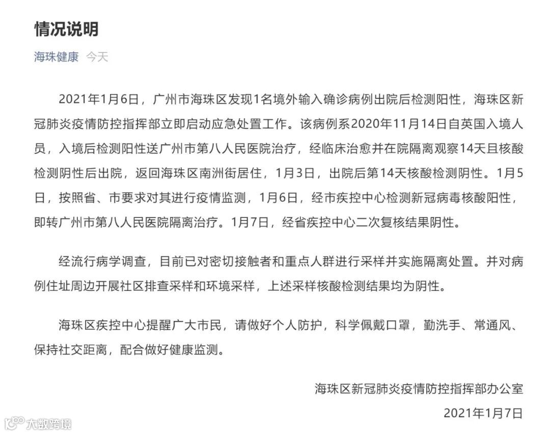 据广州市海珠区新冠肺炎疫情防控指挥部办公室1月7日通报:2021年1月6日,广州市海珠区发现1名境外输入确诊病例出院后检测阳性,海珠区新冠肺炎疫情防控指挥部立即启动应急处置工作。该病例系2020年11月14日自英国入境人员,入境后检测阳性送广州市第八人民医院治疗,经临床治愈并在院隔离观察14天且核酸检测阴性后出院,返回海珠区南洲街居住,1月3日,出院后第14天核酸检测阴性。1月5日,按照省、市要求对其进行疫情监测,1月6日,经市疾控中心检测新冠病毒核酸阳性,即转广州市第八人民医院隔离治疗。1月7日,经省疾控中心二次复核结果阴性。