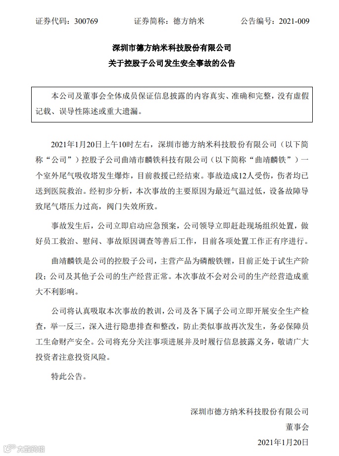 据悉,发生爆炸公司已确定系德方纳米控股子公司曲靖市麟铁科技有限公司。该公司主营纳米粉体材料试剂、纳米粉体标准样品、纳米材料产品(均不含限制项目)的研发、销售;纳米磷酸铁锂(不含危险化学品)生产、销售;纳米材料产品及技术进出口;货物进出口业务(国家禁止或涉及行政审批的货物除外);矿产品销售。