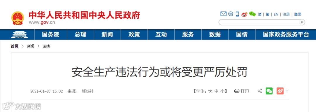 据新华社,强化企业安全生产主体责任、加大违法行为处罚力度。1月20日首次提请十三届全国人大常委会第二十五次会议审议的安全生产法修正草案,进一步加大对生产经营单位及其负责人安全生产违法行为的处罚力度。