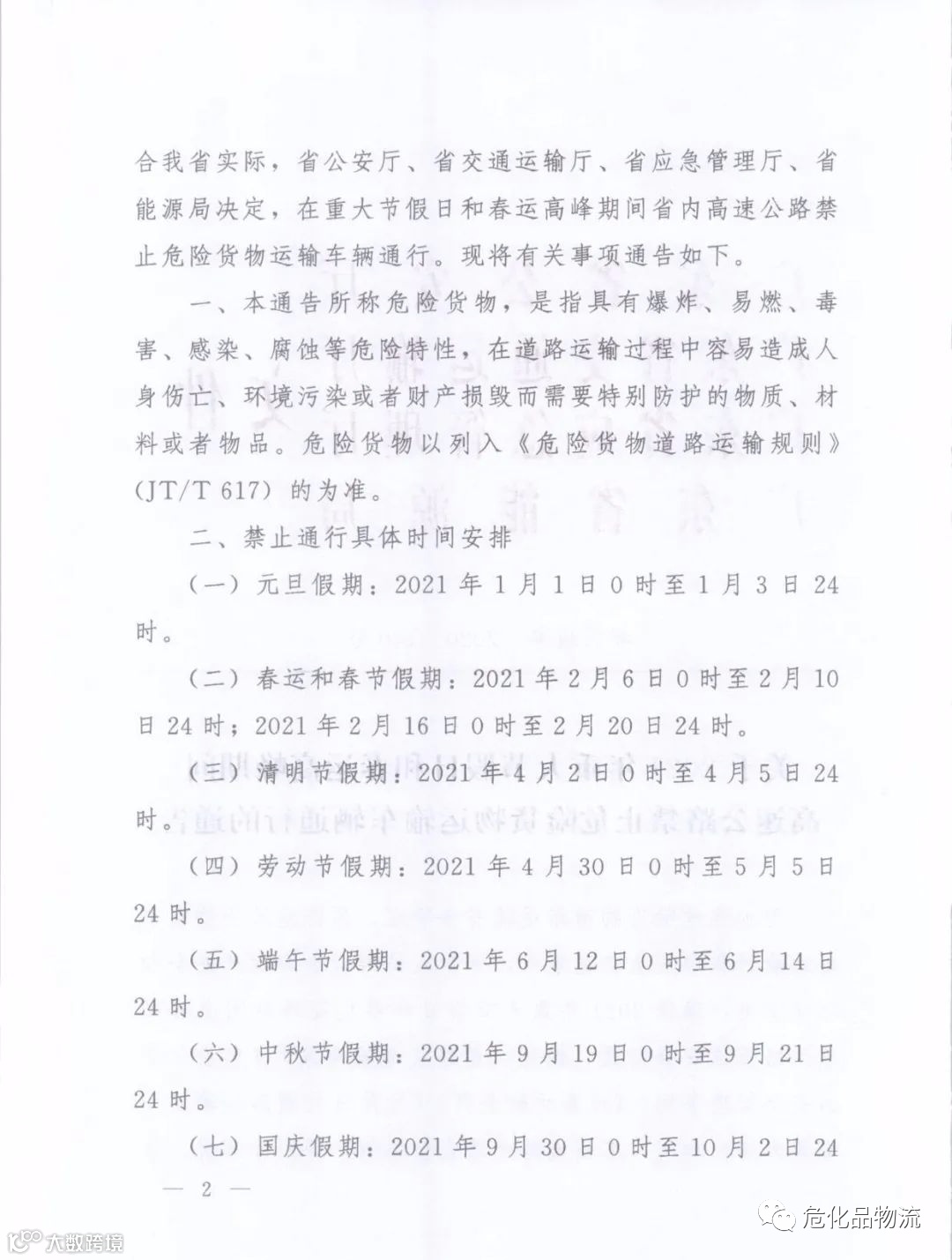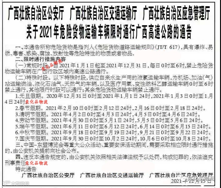 全年常规:0时--次日凌晨6时,高速路及国道禁止危化车通行。