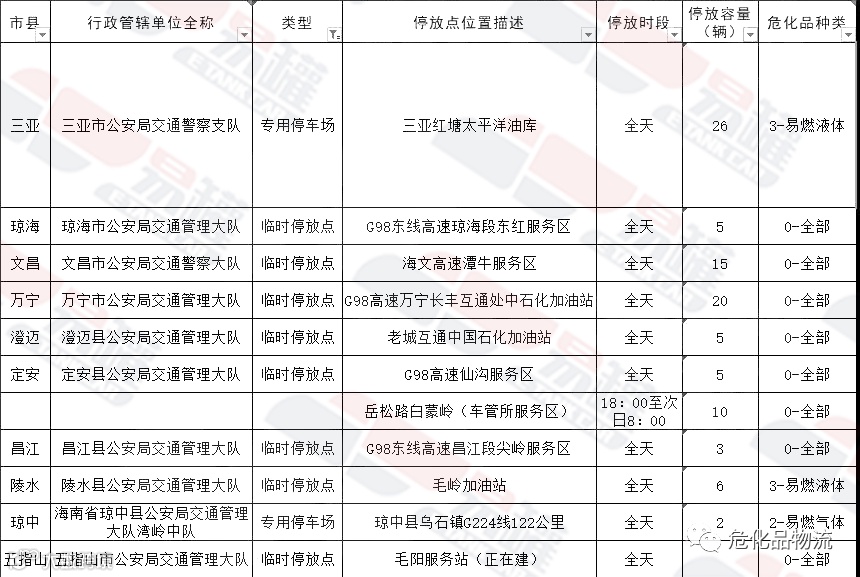 海南省危化品运输车许可停放点: