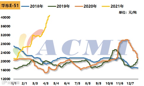 醋酸:目前华东地区醋酸报价7000元/吨上方,较年初上涨2700元/吨,涨幅62.79%。最主要的原因还是在于供需面的不平衡。醋酸下游新增主要集中在PTA行业,累计新增产能870万吨/年,相当于理论上每年增加了约50万吨的醋酸需求。而供应方面来看,2020年国内醋酸产能只有陕西延长扩产10万吨/年,因此其供应支撑作用微乎其微。