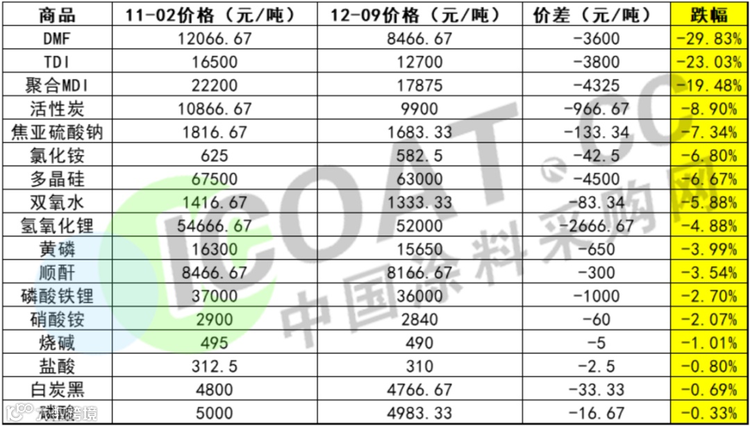 降幅榜前三位分别为DMF(-29.83%),TDI(-23.03%),聚合MDI(-19.48%),焦亚硫酸钠、多晶硅等14种原材料跌幅在20%以下。