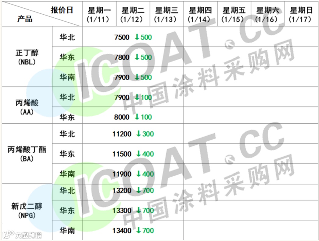 11日,正丁醇报价7366.67元/吨,较月初价格下调1900元/吨,降幅20.50%。万华化学正丁醇华北区域较月初下跌1400元/吨,华东、华南区域较月初下跌1500元/吨。上游丙烯市场行情下跌,较月初下跌1.13%,对正丁醇产生利空影响。临近春节,加之物流陆续停运,下游虽有备货计划,但对高价抵触也始终存在,因此,短期内国内正丁醇市场行情难以回升。