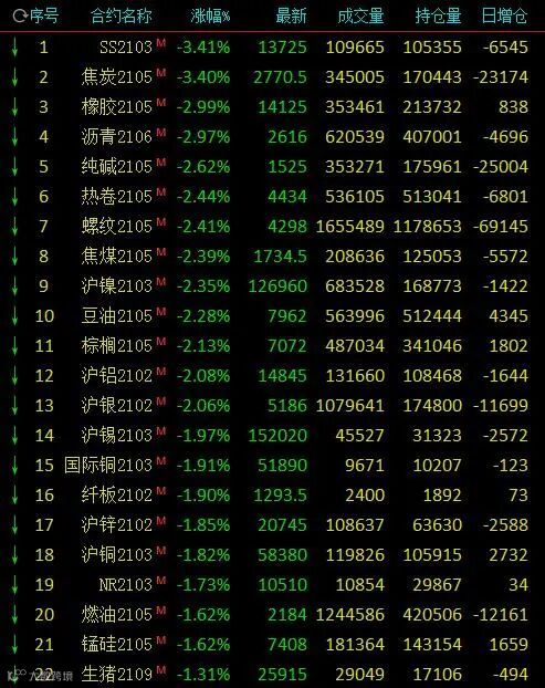 12日国内期市早盘多数品种下跌,有色与黑色系跌幅居前,不锈钢、焦炭跌逾3%,热卷、螺纹、焦煤、沪镍、沪铝跌逾2%;能化品多数下跌,橡胶、沥青跌近3%,油脂齐跌,豆油、棕榈油跌逾2%。众多化工原材料也在2021开年就陷入了“跌势”。