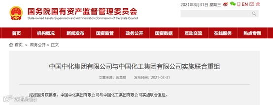 紧接着,中化集团也在官网发布了联合重组的消息,称两家公司实施联合重组,新设由国务院国有资产监督管理委员会代表国务院履行出资人职责的新公司,中化集团和中国化工整体划入新公司。