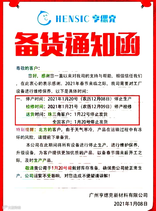 停产时间:2021年1月20号(农历12月08日)停止生产