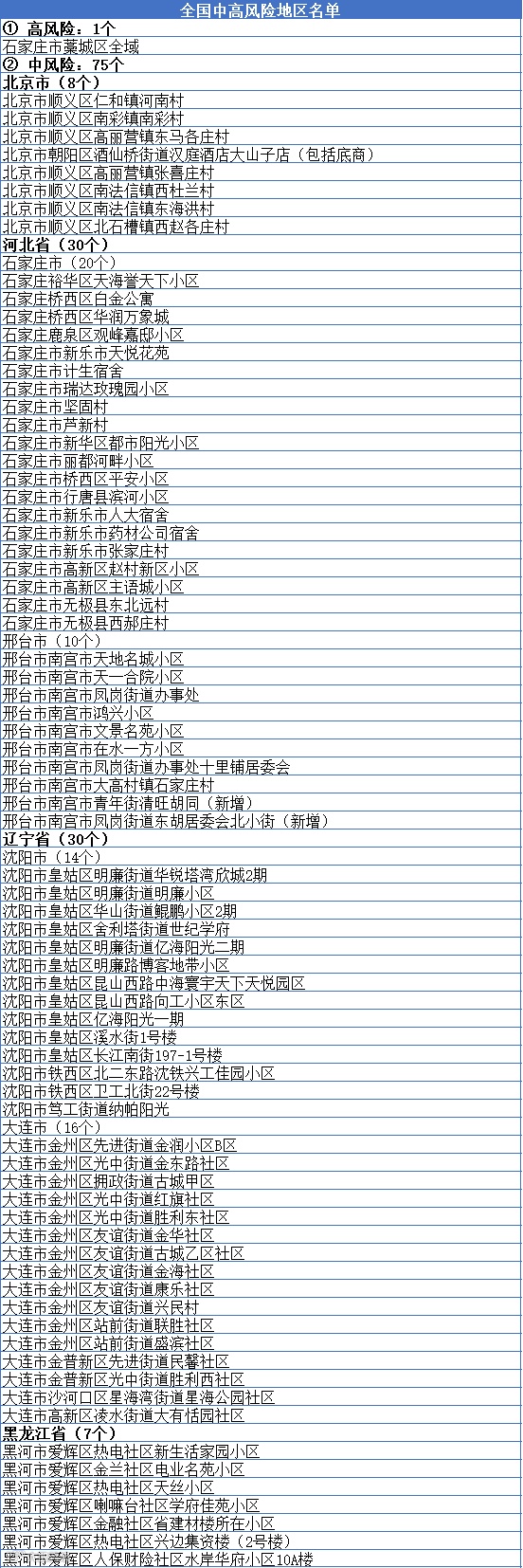 目前全国有1个高风险地区,在河北;75个中风险地区,其中8个在北京、30个在河北、30个在辽宁、7个在黑龙江。