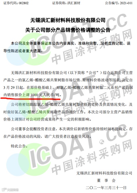 无锡洪汇新材料:3月29日起,对氯乙烯-醋酸乙烯共聚树脂二元系列产品的国内销售报价上调1000元/吨。