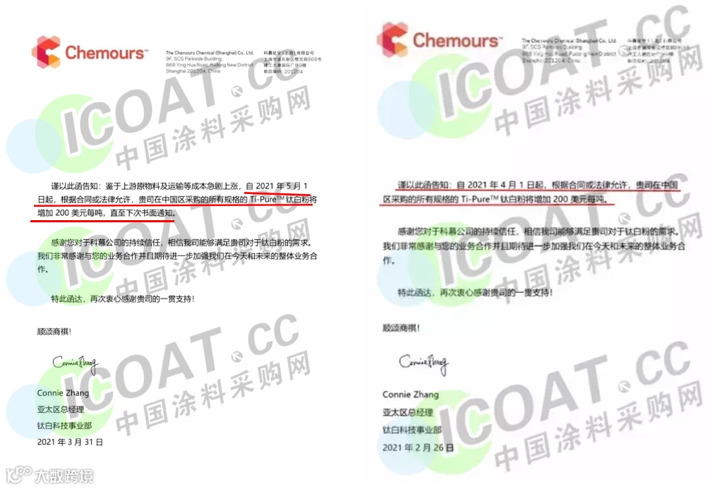 科慕化学发函,称5月1日起,钛白粉将增加200美元/吨(约合人民币1313元/吨)。而在2月26日,科慕曾发函宣布4月1日起,钛白粉价格调涨200美元/吨(约合人民币1313元/吨)。