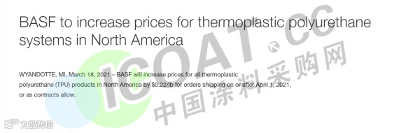 巴斯夫将在2021年4月1日或之后发货的订单,或在合同允许的情况下,将北美所有热塑性聚氨酯(TPU)产品的价格提高3185元/吨。