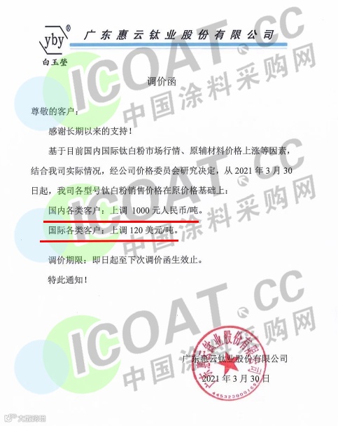 广东惠云钛业股份有限公司:3月30日起,各型号钛白粉销售价格在原价格基础上,国内各类客户上调1000元/吨,国际各类客户上调120美元/吨。