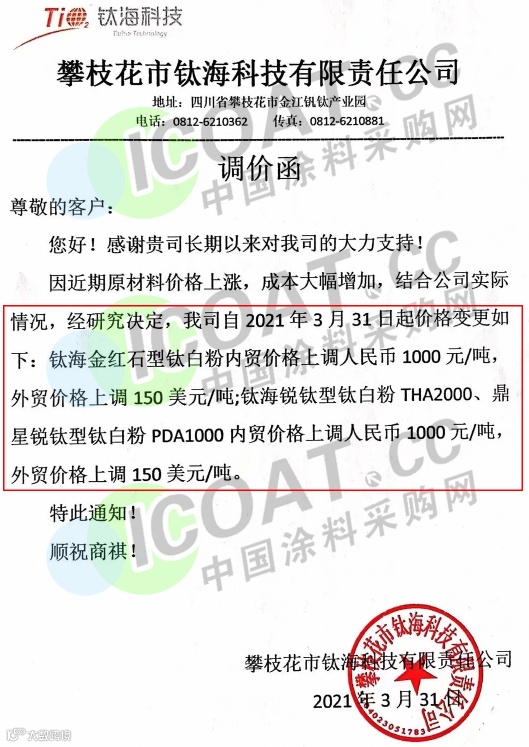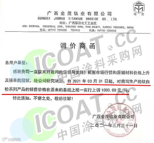 广西金茂钛业:自2021年3月31日起,钛白粉系列产品的销售价格在原来的基础上统一实行上调1000元/吨。