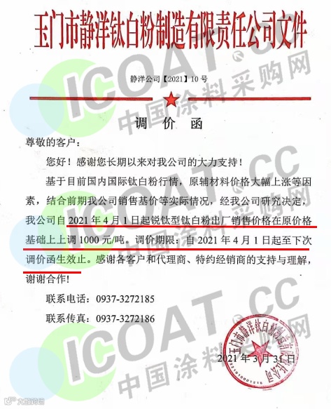 玉门市静洋钛白粉:4月1日起,锐钛型钛白粉出厂销售价格在原基础上上调1000元/吨。