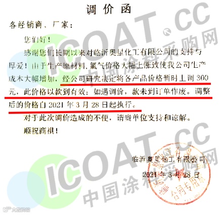 临沂奥星化工:即日起各产品价格暂时上调 300元,此价格以款到有效:如遇调价,款未到订单作废。