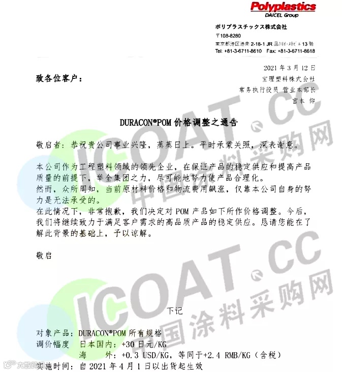 宝理塑料株式会社:自 2021年 4月1日以出货起生效,DURACON·POM 所有规格调价幅度如下:日本国内:+30日元/KG(约合人民币1803元/吨);海外:+0.3 USD/KG,等同于2400元/吨(含税)
