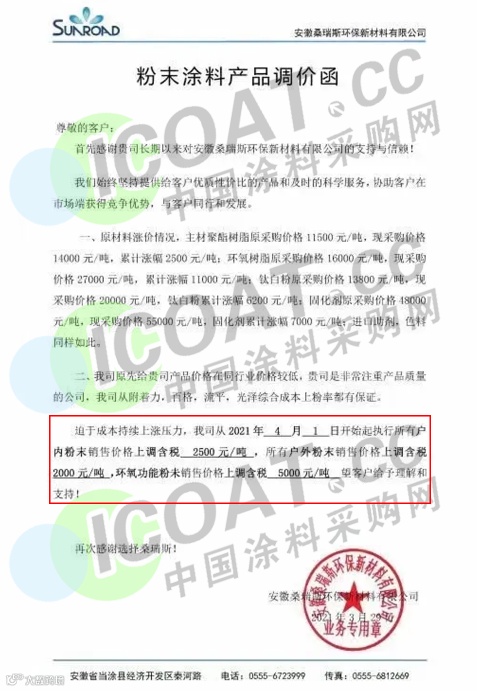 桑瑞斯环保新材料:4月1日起所有户内粉末价格上调2500元/吨,户外粉末销售价格上调2000元/吨,环氧功能粉末销售价格上调5000元/吨。