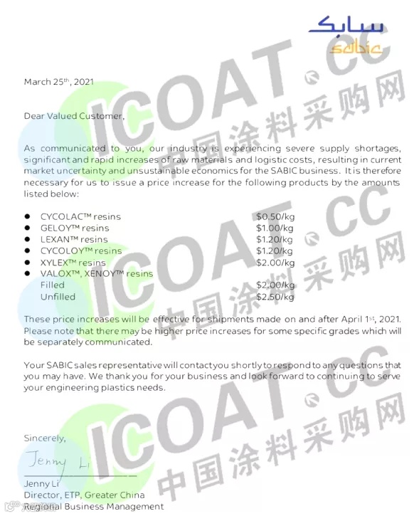 SABIC:4月1日起,SABIC将对以下产品进行提价: