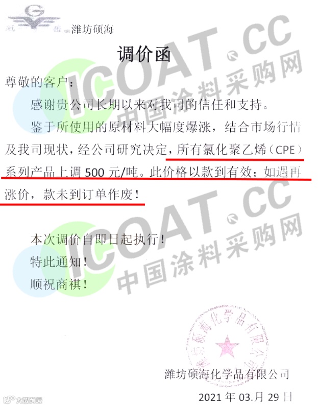 潍坊硕海:所有氯化聚乙烯(CPE)系列产品上调 500 元/吨。此价格以款到有效;如遇再涨价,款未到订单作废。