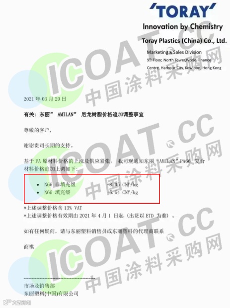 东丽:4月1日起,尼龙66(非填充级):+8.05元/kg(+8050元/吨); 尼龙66(填充级):+5.64元/kg(+5640元/吨)。