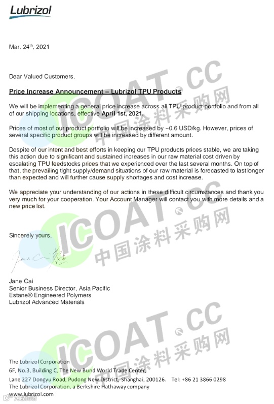 路博润:4月1日起,公司大多数TPU产品组合的价格将增加3942.5元/吨。其他特定产品组的价格将增加不同的数额。