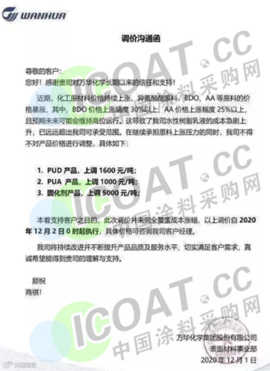 万华化学宣布12月2日起,以下产品涨价: