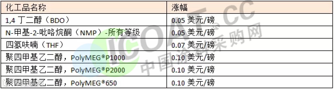 聚四甲基乙二醇,PolyMEGP1000涨0.10 美元/磅