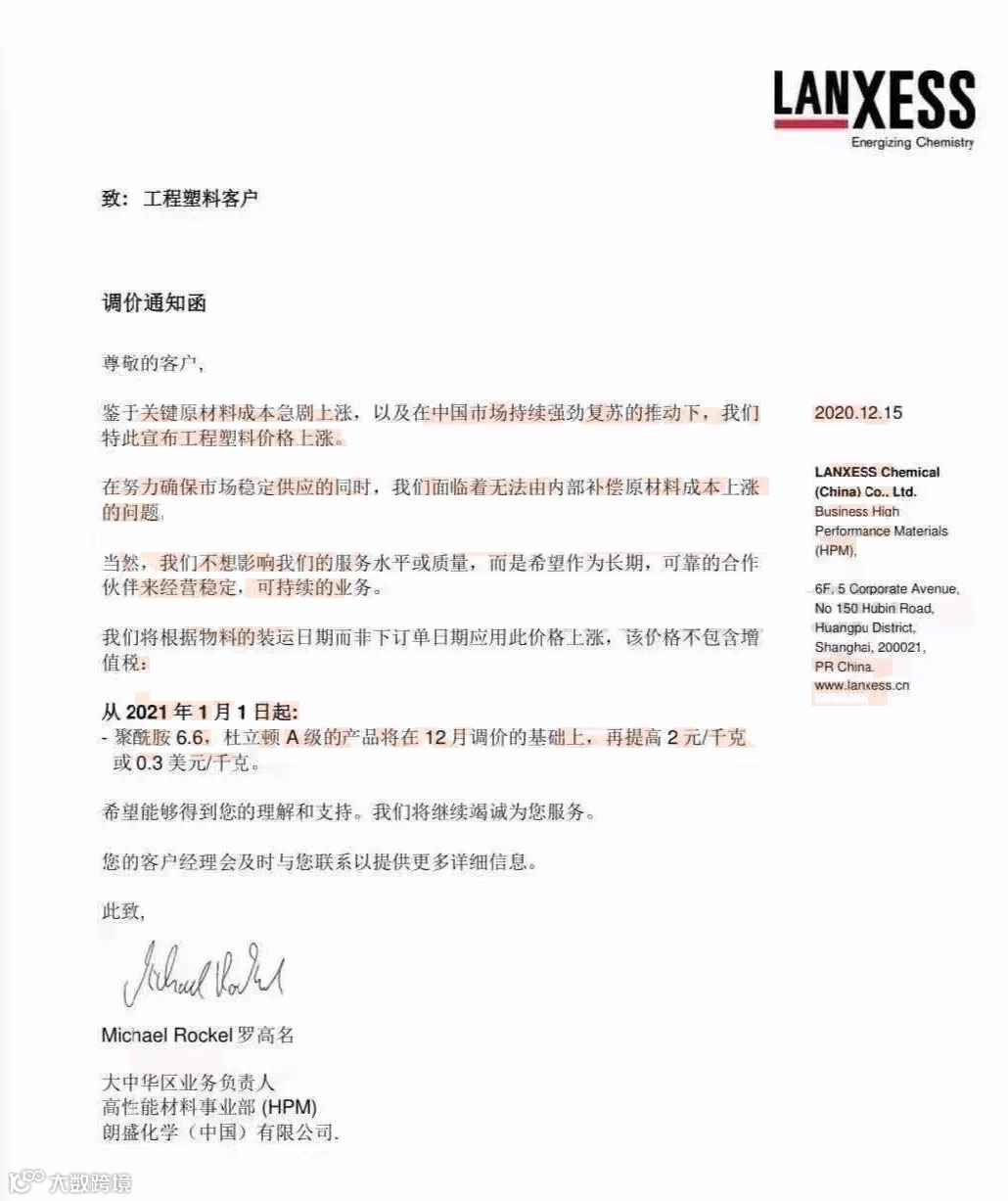 除了化工原材料价格蠢蠢欲动,不断拉涨外,杜邦、朗盛、万华、巴斯夫等知名化工企业也积极发函宣布产品价格调涨,为市场中浓厚的涨价氛围“火上浇油”。