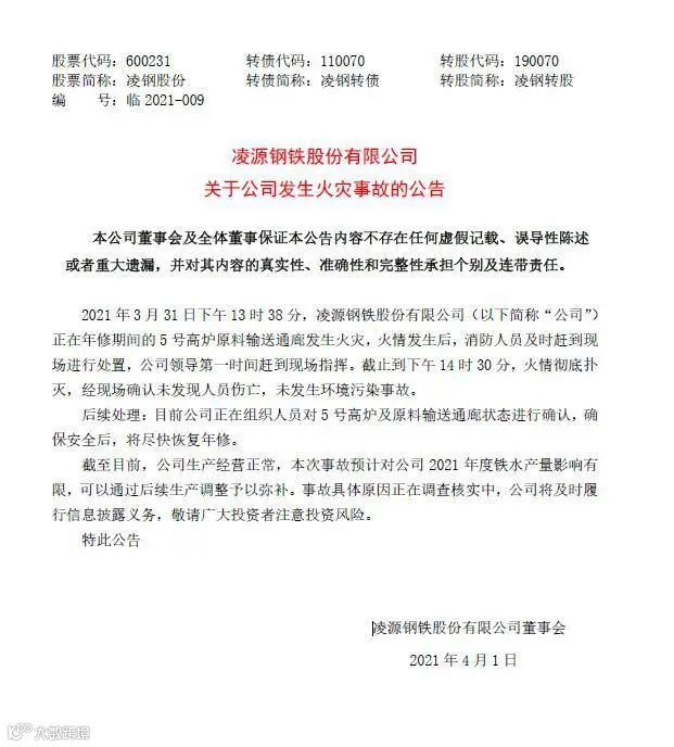 同日,辽宁卫视报道,辽宁的一家拥有40年历史的冶炼大厂凌钢集团突发火灾,5号高炉及原料输送廊瞬间被大火吞噬,视频显示原料廊坍塌倒下,宛如恐怖袭击