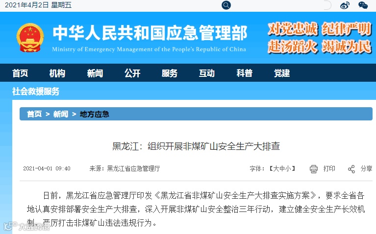黑龙江应急管理厅印发《黑龙江省非煤矿山安全生产大排查实施方案》,3月28日-12月31日对非煤矿山进行排查,对重大隐患落实停产整顿、挂牌督办、整改销号等安全措施。