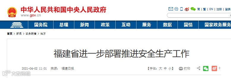 4月1日,福建省开展全省安全生产视频会议,并对省内各地布置新一轮的工作任务。重点检查道路运输、消防、危险化学品、矿山、工贸等重点行业领域安全,遏制安全事故发生。