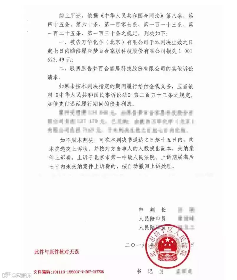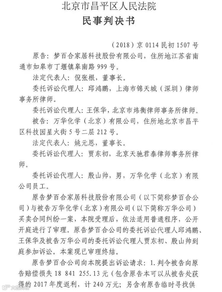 一气之下,梦百合将万华化学诉至法庭。2019年11月,法院判决梦百合胜诉,万华化学赔偿梦百合100.16万元。