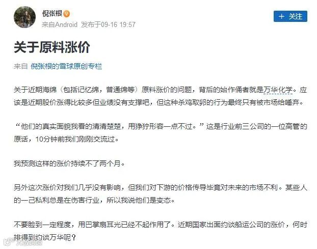 2020年9月16日,倪张根发文称,近期海绵(包括记忆绵,普通绵等)原料涨价的问题,背后的始作俑者就是万华化学,“这种杀鸡取卵的行为最终只有被市场给唾弃”。