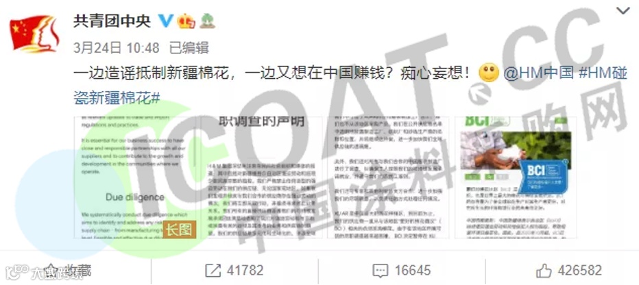 近日,“H&M声明抵制新疆产品”引发大众激烈不满。H&M集团声称,“我们不与位于新疆的任何服装制造工厂合作,也不从该地区采购产品/原材料。”消息一出便引起社会各界广泛关注。随即,黄轩、宋茜等艺人接连发声,表示与其终止合作。淘宝、京东、拼多多等电商平台下架H&M相关产品。外交部、国防部、商务部、中消协、等也就“H&M时间”做出回应。共青团中央更在官方微博点名HM,称“一边造谣抵制新疆棉花,一边又想在中国赚钱?痴心妄想!”,直接把H&M推上了热搜。