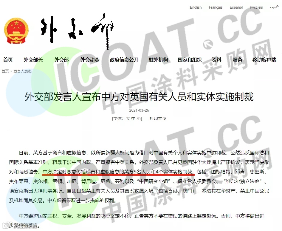 昨日(26日),外交部表态称,日前英方基于谎言和虚假信息,以所谓新疆人权问题为借口对中国有关个人和实体实施单边制裁,严重损害中英关系。中方决定对恶意传播谎言和虚假信息的英方9名人员和4个实体实施制裁。自即日起禁止有关人员及其直系家属入境(包括香港、澳门),冻结其在华财产,禁止中国公民及机构同其交易。中方保留采取进一步措施的权利。