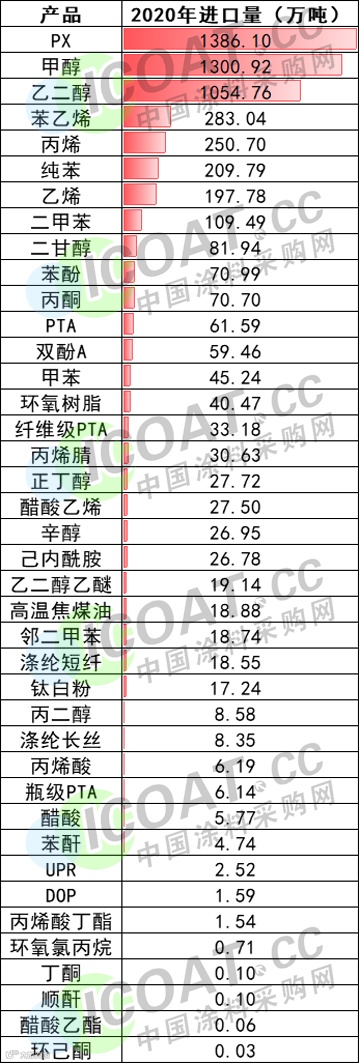 据涂料采购网不完全统计,我国化工行业40余种原材料有进口需求,其中丙烯、纯苯、乙烯、苯乙烯、苯酚等石油产业链上游的部分化工原材料位居前列,年进口量最高超过1000万吨/年。据工信部数据,在关键基础化工材料中,我国32%的品种仍为空白,52%的品种仍依赖进口。如高端电子化学品、高端功能材料、高端聚烯烃等,难以满足经济与民生需求。