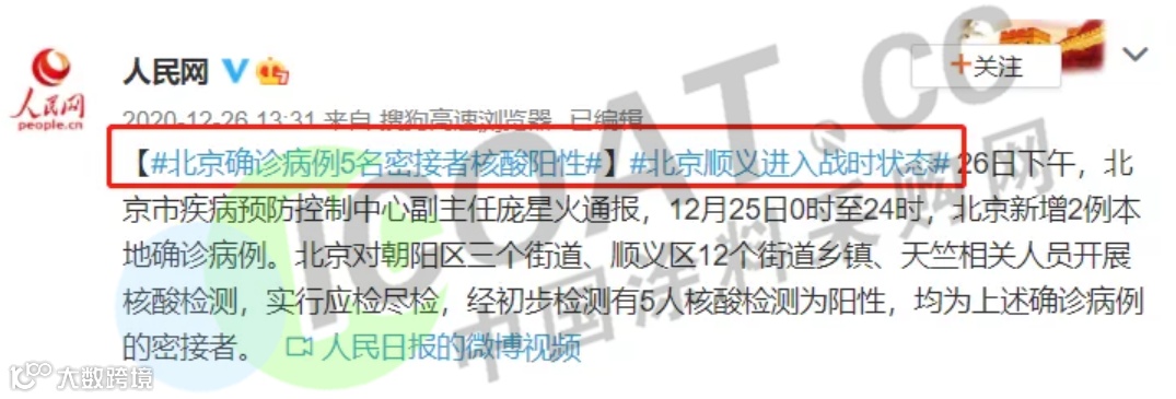 北京12月25日新增2例本土确诊病例,居住地均为顺义区,顺义区进入战时状态。相关部门已对5名检测阳性者所居住的顺义区南法信镇西杜兰村、东海洪村进行封闭式管理,全部落实管控措施。