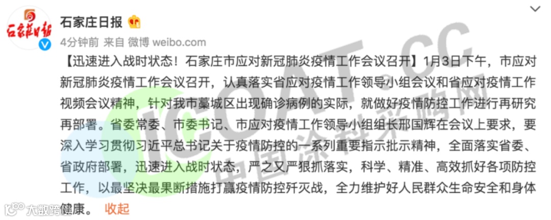 据河北省卫健委消息,2021年1月3日0时至24时,河北省新增报告4例本地新型冠状病毒肺炎确诊病例,无新增死亡病例,无新增疑似病例。同日,河北省石家庄市通报1确诊病例,出现疫情的藁城区果庄村已经封闭,省二医院也因疫情停诊。而河北省邢台南宫市也发现核酸检测阳性患者,出现疫情的小区被封,居民开始在超市抢购。