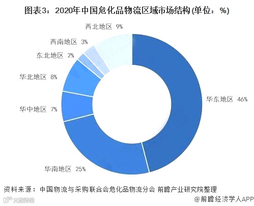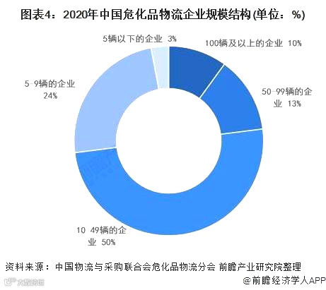 据前瞻经济学统计,2020年中国危化品物流企业达1.27万户,主要分布在华东地区。车辆在100辆及以上的企业为占比约为10%,车辆在50-99辆的企业为占比约为13%,而10-49辆的企业有6400户,占比为50%。整体来看,行业以中小规模企业为主。