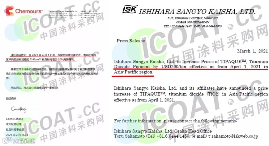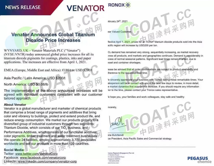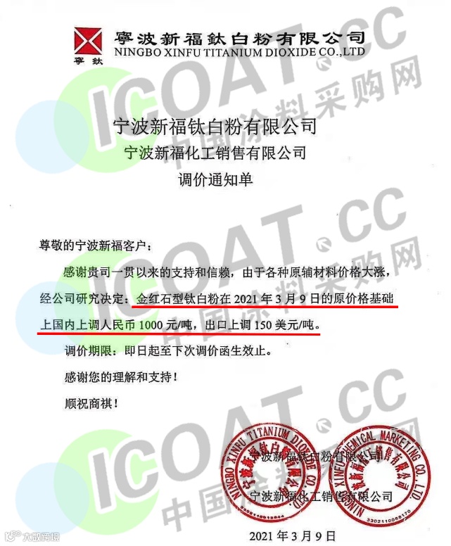 昨日(3月9日),宁波新福钛白粉有限公司发布调价通知单,称金红石型钛白粉在3月9日的原价格基础上国内上调人民币1000元/吨,出口上调150美元/吨。据悉,这已经是宁波新福本年度第三次调涨,全年累计国内售价上涨2600元/吨,国际售价上涨400美元/吨。