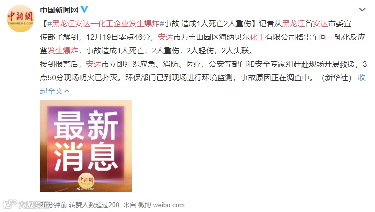据新华社报道,12月19日零点46分,黑龙江省安达市万宝山园区海纳贝尔化工有限公司格雷车间一乳化反应釜发生爆炸,事故造成1人死亡,2人重伤,2人轻伤,2人失联。